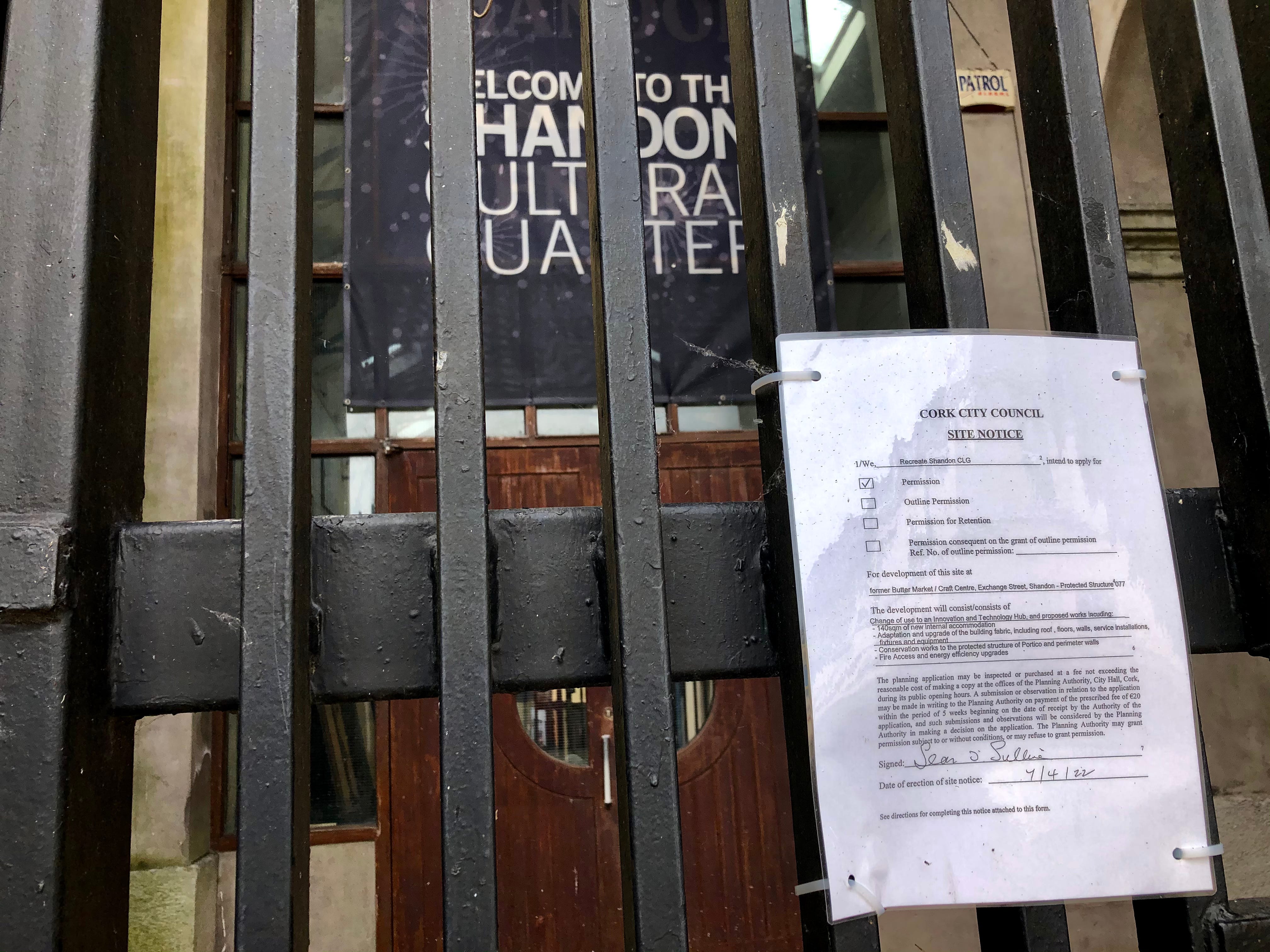 On the gate of the Butter Exchange, there’s a planning notice. A planning application for permission to convert the building into a technology and innovation hub called Shandon Exchange was lodged with Cork City Council this April.