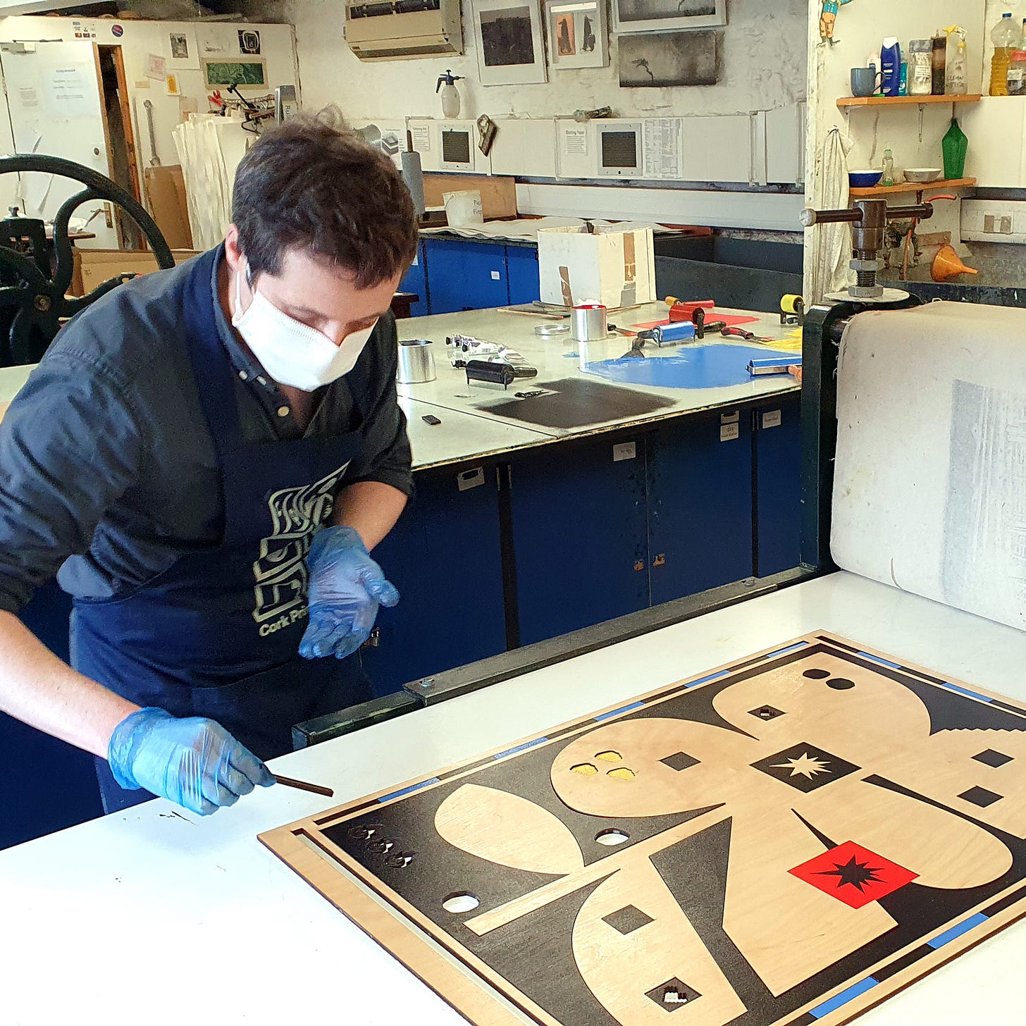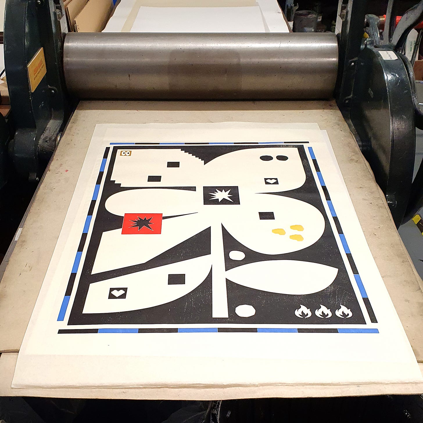 The prints in their new exhibition are in keeping with the Project Twins aesthetic which might be neatly summed up as simple is best. (Simple is also often the hardest thing to get right - which might point to why haikus are so hard to perfect). At a base and abstract level the prints are premised on flowers with icons worked into them. The brothers had started on the designs at some stage in the pandemic and finished them off at the Printmakers, but it’s only now that they’re seeing the light of the day.